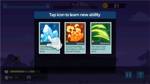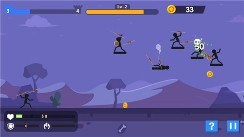 1、在《火柴人神射手》里,你只需滑动屏幕就能射出手中的武器,滑动的速度越快,敌人就越不堪一击。