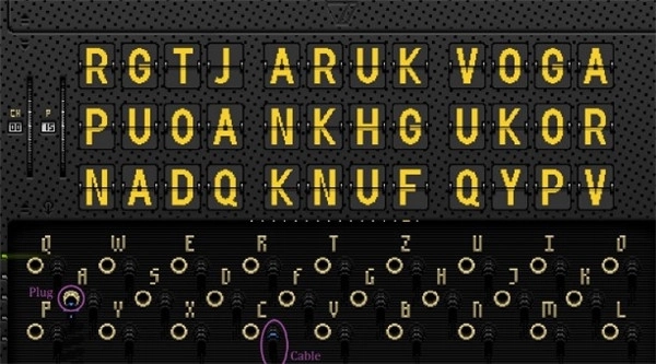 解法:玩家只需插对5个位置就行,按照关键词密码规则,把蓝字的前五位THEFU拖到对照卡尺的前端,再依据前五位对照规则进行插孔操作。
