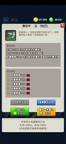 (3斧头攻击力等)因为斧头的攻击生命是所有斧头的综合等级乘以该斧头的基础倍数(斧上有标注),所以金币不要只投入到一个斧头的等级提升上,这样才能在短时间内实现增益最大化。