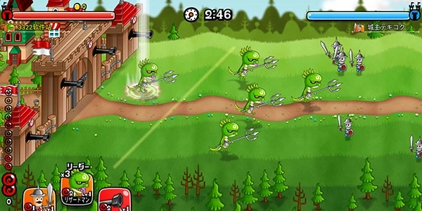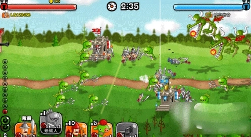 游戏采用横向战场布局,敌我城堡分别位于左右两侧,战场上设有3个可反复争夺的出生点,每攻陷一个就能推进兵线。每场战斗玩家可随机挑选8个可用兵种单位,依据不同的点数消耗和数量限制,玩家能够制定多样的战斗策略。