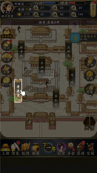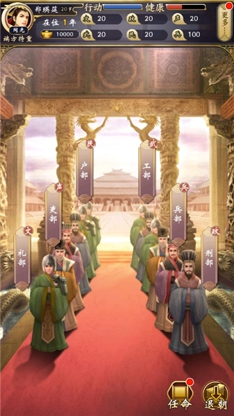 2、第一步是参与上朝流程,随机选取兵部、礼部等部门呈上的奏折进行处理,依据不同的选择结果,会相应地增加或减少声望与政务数值。