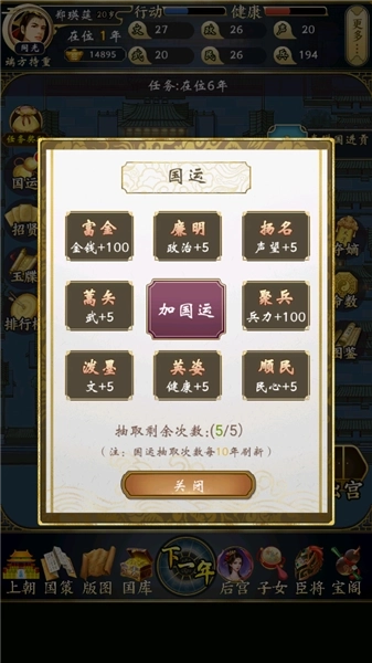 6、拥有五次免费抽取国运的机会,次数耗尽后每十年才会刷新一次。