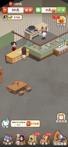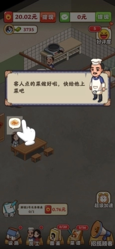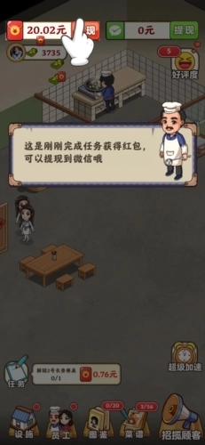 真香大饭店红包赚钱版是一款有趣的烹饪模拟游戏,它采用了精致的卡通画风,整体呈现出Q萌可爱的视觉效果,光是这个风格就十分吸引人。在游戏里,玩家将经营一家饭店,扮演餐厅老板的角色,需要用心打理自己的店铺,负责餐厅的各项运营管理工作,比如每日的食材采购、菜单制定、员工招募等,这些都是日常需要准备好的事务。同时,玩家还得不断升级饭店,让店铺看起来更加整洁干净。游戏的玩法内容相当丰富,设有许多任务等待玩家完成,玩家每天都需要查看游戏页面左下角的任务,每次完成任务后都能获得不少红包奖励,这些红包可以积累起来,达到一定数量后就能直接提现到微信。所以,这也是一款能让玩家在玩游戏的同时赚取红包的模拟烹饪类游戏。