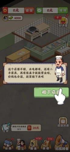 1、玩家打开游戏进入主界面后,系统会提供新手引导教程,第一步需要完成店面的租赁操作。