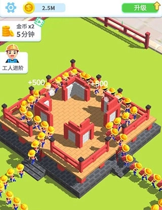 2、每位工人可获得500金币的收益,点击升级即可领取对应的金币大礼包。