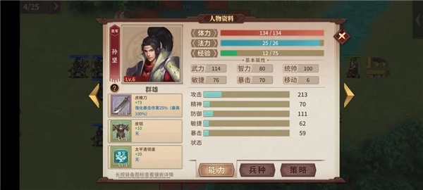 人物的属性包含武力、智力、统御、敏捷与运气这几项,玩家只要食用对应的果子,就能提高武将相应的能力。