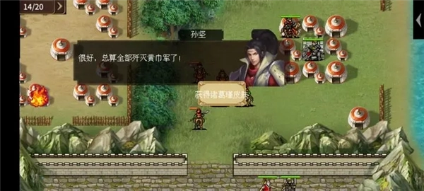 这关难度不高,孙坚登场时并非如作者描述的直接降防御和士气,而是靠近贼首后才会触发对方防御下降的效果。此关共有5个豆,左侧的村庄没有豆,无需前往,击败贼首可获得太平清领道。