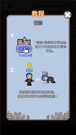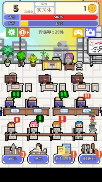 当经验值满了以后,玩家将获得一次晋升机会,这个机会根据此时玩家的晋升几率决定是否成功,这也意味着,从实习期结束后能否成为正式员工依然全看运气,稍有不慎就会再度失业。