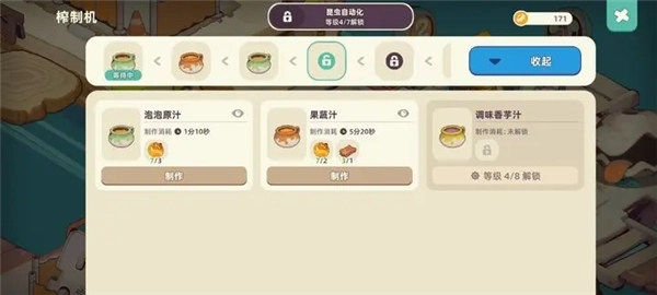 1.榨汁机:优先做“泡泡原汁”(1分10秒,材料易获取),它是多款汽水的基础原料,批量生产储备;