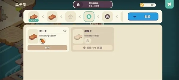 1.种植台:优先种萝卜草种子(看种植台截图,萝卜是“健康果蔬汽水”“晕乎乎苏打”材料,也是风干架做萝卜干的原料),它种植时长短(2分40秒)、产出稳定,能快速供应汽水/加工材料。