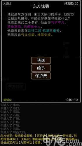 走正义路线的话,就去挑战阿飞和七哥;选邪恶路线的话,就去对付叶良辰和赵日天;要是选双九路线的话,打哪个都可以。打赢之后能得到30点正义值或者邪恶值,还有5000钱,从这里开始,正义路线和邪恶路线就真正分道扬镳了: