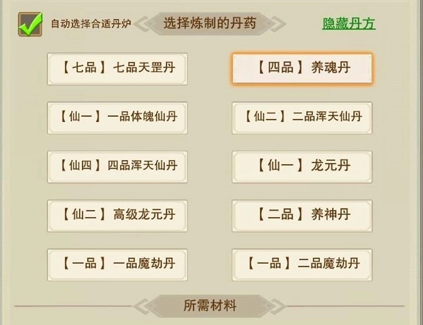 5品及以上的炼丹炉与炼器炉所需材料一致,均为玄星石、蓝晶石和金岭砂。其中5品炉需三种材料各100份,6品各200份,7品各400份,8品各800份,9品各1600份。