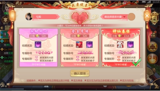 结婚设有三个可选档次,档次越高对应的奖励越丰厚。当完成全部三档结婚流程后,还能额外获取一个珍稀称号。