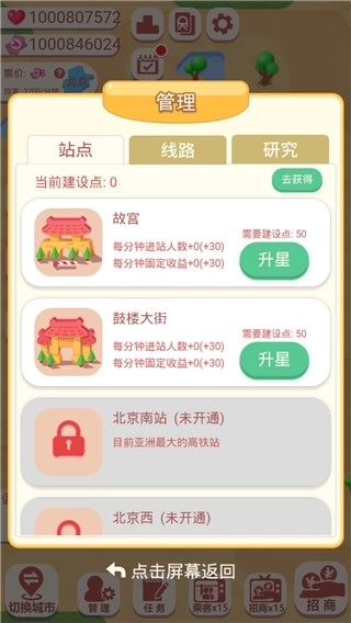 3、首先是一个起始站,你需要经过许多的站点,积累你的财富,开创众多的地铁线路