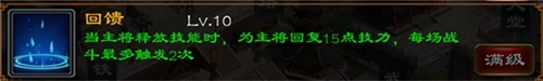 回馈是技力恢复类技能,满级状态下,每当主将释放技能时,可恢复15点技力,每场战斗最多触发两次。平心而论,这个技能或许更适配统将与智将,但用在吕布身上也能带来意想不到的效果——能多释放一次大招,其实也挺不错的。