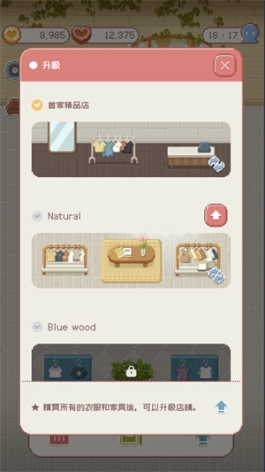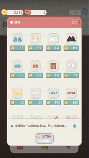 1、阶段升级: 随着游戏的进行,玩家可以解锁新的服装款式,提升店铺的吸引力。