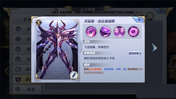 这套阵容一眼就能看出,拉达曼迪斯、神圣衣天马和射手座是核心输出斗士,他们仨都具备超强的输出实力。拉达曼迪斯在后期完成注能后,释放的最大警戒能对敌人造成海量群体伤害,不少敌方阵容在他面前都会轻易被击溃。