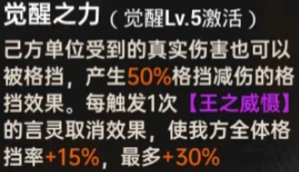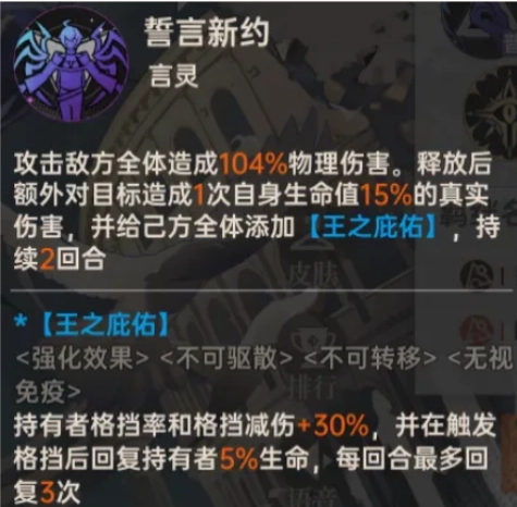 零号的言灵【誓言之约】则是零号三大核心机制之一的【格挡】,言灵在造成伤害时,附加自身生命值的真实伤害,同时给己方添加【王之庇佑】,持有者的格挡率和格挡减伤增加 50%,并在触发格挡后回复自身 5% 的生命值。(友情提示:【王之庇佑】是双源同调的带有 “无法支援” 词条的强化效果,即不会受到 “无法强化” 的影响)