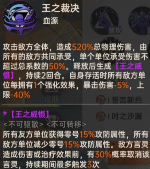 零号的血源则引出了他三大核心机制之一的【王之威】的言灵机制,自身存在时,根据敌方强化效果累加去计算,上限为 40%,在目前言灵、王之威 buff 的泛用的环境下,这个上限是很容易填满的,零号释放血源造成伤害时,会生成对应同路同的领域类效果【王之威】,让己方获得零号 15% 的攻防属性,同时敌方少零号的攻防属性,和给己方克制自身的拥有相应肖像。