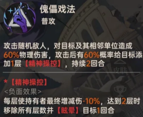 零号的普攻为攻击随机敌人,并拥有 60% 的概率给其与相邻单位添加【精神操控】,【精神操控】能降低持有者 10% 的最终增伤,达到两到层数时并移除和添加【眩晕】。