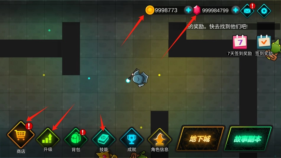1、进入游戏界面,法师是可以自动打怪的,无限的游戏币和钻石,可用于购买商品,升级和技能。