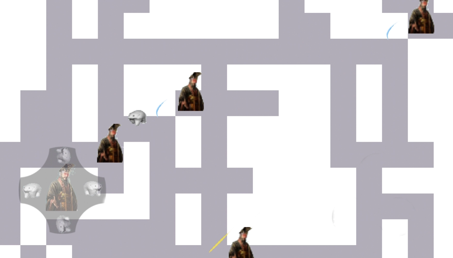3、左下角设有虚拟摇杆,可操控北极熊进行上下左右的移动,在此过程中需躲避秦始皇的追击,只要找到迷宫大门并将其打开就能顺利通关!