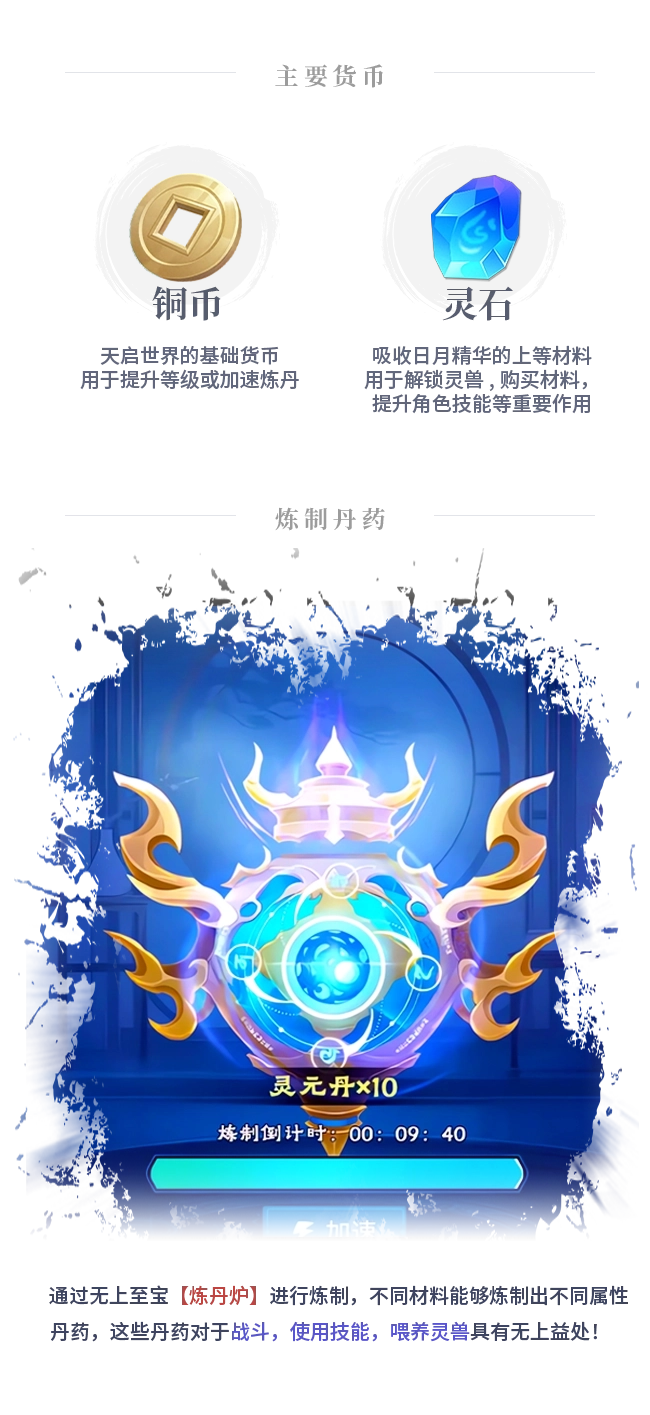 在【炼丹炉】中,修士可将灵材炼化为【破境仙丹】;于【御兽灵府)内,则可培育青龙、白虎等灵兽,收获【灵石】用以强化神通。