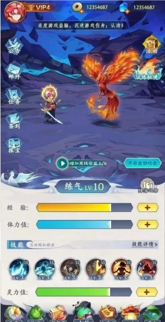 玩家攻击妖兽可随机获得铜币和经验,每10级突破练气、筑基等境界,升级能解锁技能限制;6种技能是击杀毒boss的关键,毒boss掉落的丹药、材料等资源可直接挂售、炼丹后挂售或用于培育灵兽获取长期收益,技能使用有次数限制且消耗体力,开通年卡可增加每日每个技能的使用次数。