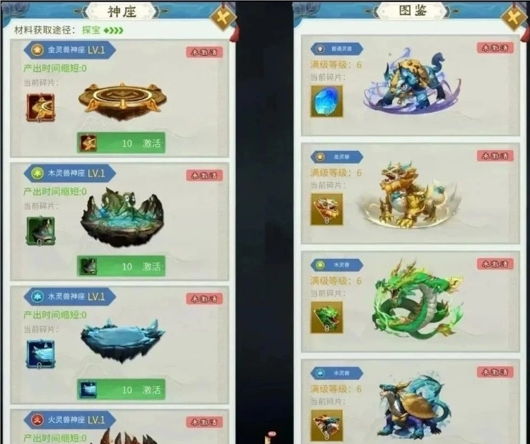 灵兽分普通、金木水火土六种,普通灵兽需6个灵石激活,其他需100个对应碎片(碎片可通过技能打boss或集市购买);激活后每日需喂养对应丹药(丹药可集市购买或材料炼制)才能产出灵石,而用神作碎片获得的神作给灵兽安装后可加速产出,神作材料可通过探宝或集市购买。