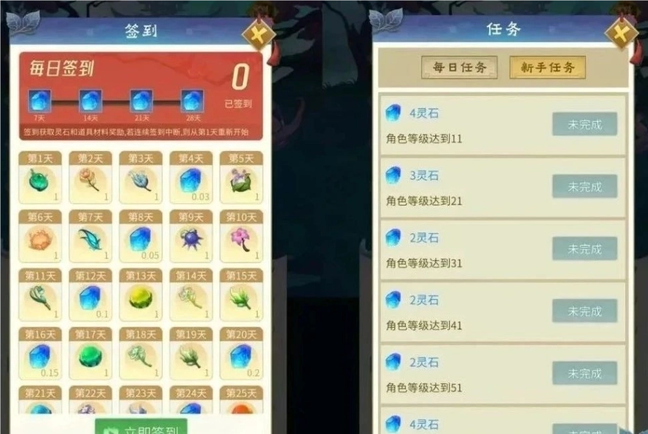 游戏内每日签到奖励实用丰富,不仅有灵石、稀缺材料,连续签到还能解锁灵草、丹药;玩家达到指定等级时,可领取灵兽成长丹、灵石等丰厚奖励,助力快速提升技能威力、培育强力灵兽,加速推进游戏进程。