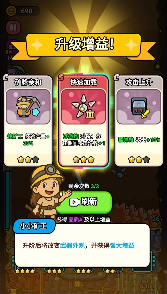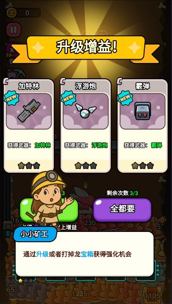 3、挑选增益来升级以提升战斗力,升级或者击败龙宝箱都能获取强化机会。