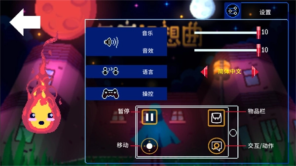 左上角的【设置】选项可用于调整背景音乐、语言和操控方式。