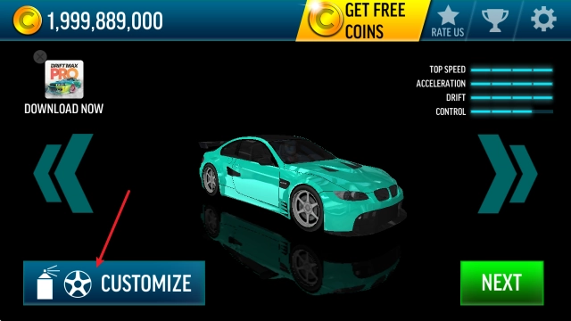 在主界面里,你可以借助左右箭头挑选心仪的汽车,之后点击左下角的customize按钮。