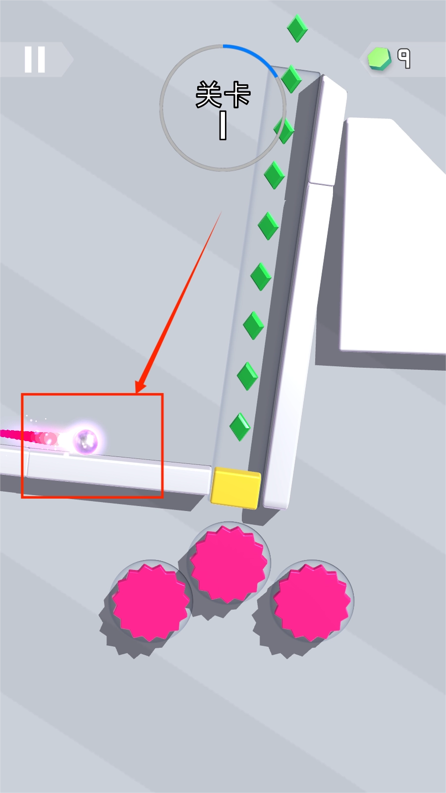 通过控制小球的弹跳完成关卡中的各种障碍物挑战。