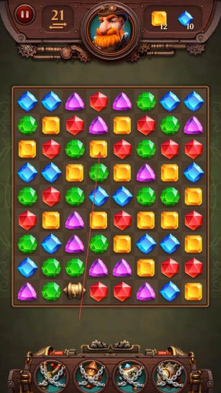 2、滑动屏幕移动宝石,让同色宝石连成3个及以上,完成消除。