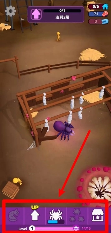 2.点击下方紫色界面的蜘蛛按钮可以进入升级界面,提升蜘蛛等级后能力将大幅增强,更能应对复杂战斗。