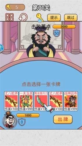 爆笑三国传是一款极具趣味性的休闲益智游戏,以三国为核心题材,玩家能以全新视角重温乱世三国的风云变幻。游戏拥有诙谐幽默的剧情与玩法,关卡设置丰富多样,全程采用卡牌作为主要玩法。每个关卡都会出现全新的BOSS,玩家与敌人将对桌而战,桌前各有一组卡牌;卡牌上印着三国中的经典人物,还能为他们配备武器,助力玩家轻松应对更多敌人!
