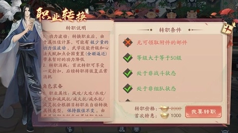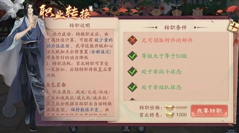 3、查看界面里的转职条件是否符合要求,若满足条件,需消耗一定数量的元宝(首次转职能享受折扣优惠,之后的转职则恢复正常消耗),接着就可以选择“我要转职”选项。