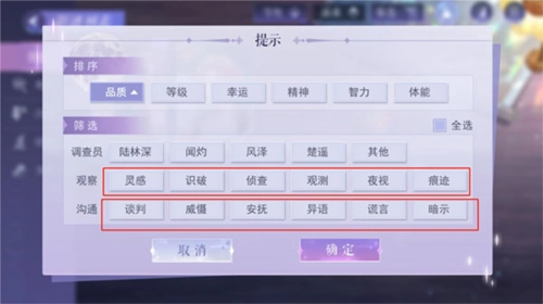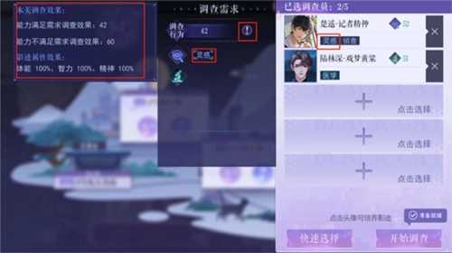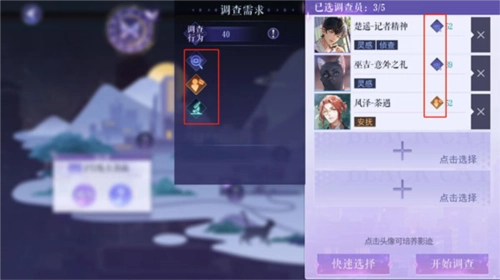 2、挑选与能力标签匹配的影迹。在现代篇第一章2号线车厢一这一关卡里,当调查效果值达标的时候,选择带有【灵感】能力标签的影迹就能开展调查。而且,并非能力标签“不满足”就一定没法顺利完成调查。要是影迹数量有限,你可以选择该类型中调查效果值“更高”的影迹来通关。另外,右上方的调查气泡也值得留意,因为它是判断当前阵容能否通关最直接的提示。