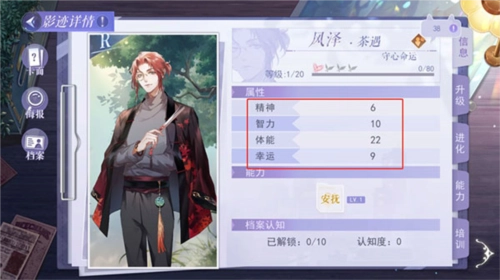 影迹的调查效果值由4个属性共同计算而来,每张影迹都具备【精神】【智力】【体力】【幸运】这4种属性,且不同影迹有着各自的属性偏向。在【影迹详情】里,升级、进化、档案、培训这些功能可用于提升这四个属性,属于养成类玩法。