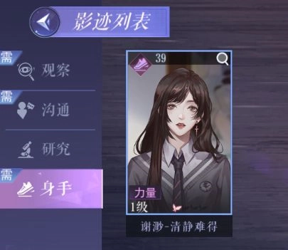 3、挑选和关卡所需能力相匹配的影迹。打个比方,像在现代篇引子-施工旧址这一关卡里,需要具备【身手】能力的影迹,就得从身手分类里选择[谢渺-清静难得]来完成通关。