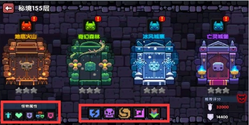 选择好想要挑战的模式后,会出现关卡层数选择界面,点击选定目标层数,接着会弹出该层不同属性秘境的选择界面,建议选择与自身角色属性相克制的秘境进入,这样能更高效地通关。(两人模式仅能选择挑战层数,秘境属性无法自主选择,会随机进入对应属性的秘境地图)