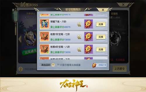 常玩网游的玩家都清楚,想拥有一套极品装备绝非易事。所以角色升级后,不妨先换上普通的高阶装备来撑属性,之后再用慢慢收集到的极品装备逐步替换。而《太古神王》里的试炼BOSS关卡,正是能让你稳定获取强力装备的日常活动,同时还会产出多种重要的养成道具。