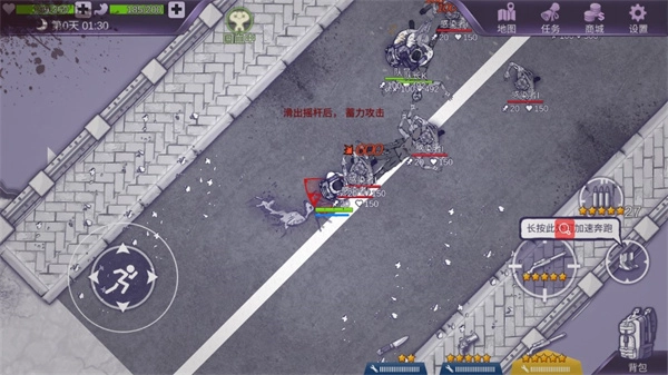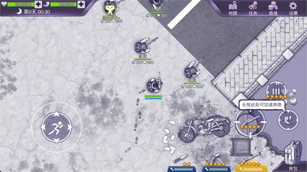6、角色操控方式:左侧轮盘用于控制角色移动,右侧区域长按可使角色进入奔跑状态,同时该区域也支持枪械攻击操作。