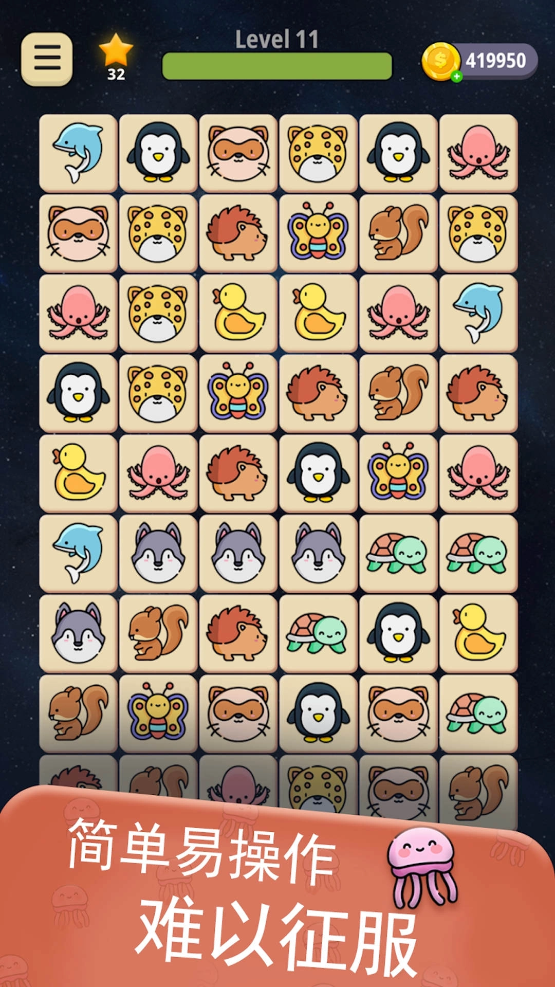 这是一款经典的休闲闯关类连连看游戏,你需要不断接受挑战哦!游戏里有美妙的背景音乐,还有多个主题可以自由切换,简约的画风让操作轻松简单易上手,能带给你最真实的竞技体验,适合各个年龄段的玩家,可谓老少皆宜,喜欢的话快来试试吧!