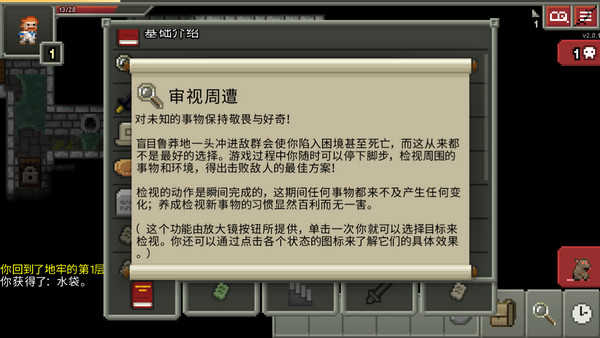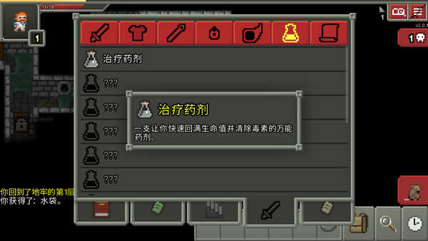 8. 对于未知的药剂,建议在房间门口或有水的地方使用,毕竟它们很可能是毒药或者火焰药。而未知的卷轴,最好是在身上有未鉴定的装备、诅咒的装备时,或者在下一层使用,因为它们有可能具备鉴定、净化或感知的效果。千万不要等到急需之时,才发现背包里有大量未鉴定的药剂或卷轴。通常来讲,在前几层,背包里数量最多的药剂大概率是治疗药剂,其中苍蝇掉落治疗药剂的概率为最高。