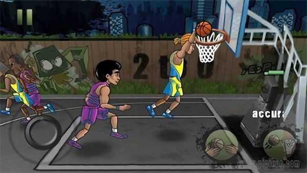 游戏操作简便,手机屏幕左侧的按键用来控制角色移动,屏幕右侧的两个按键则用于传球和投篮,并且传球键在防守时还能用来拦截对方的球。