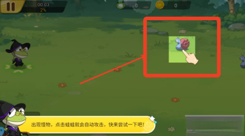 2、战斗期间,点击出现的怪物青蛙,青蛙会自行发动攻击。而且,随着挑战的深入,你还有可能召唤新的青蛙参与战斗。
