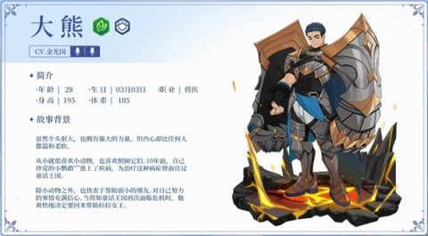 大熊身形高大、气势威猛,然而其内心却无比善良。他对可爱的东西满怀热忱,热衷于收集卡通模型,也喜爱各种小动物。表面上看,他是个十足的硬汉,可实际上,他是个温暖贴心的大哥哥。