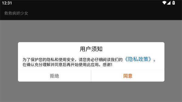 1、在安卓设备上完成“救救病娇少女”的安装,启动后仔细阅读相关使用条款,确认无问题后点击同意进入主界面。